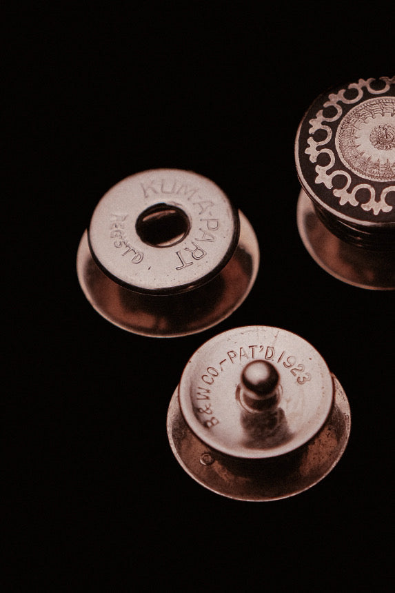 Both backs are clearly marked B&K Co. Pat’d 1923 / Kum-A-Part Regd., confirming their authenticity and historic provenance.