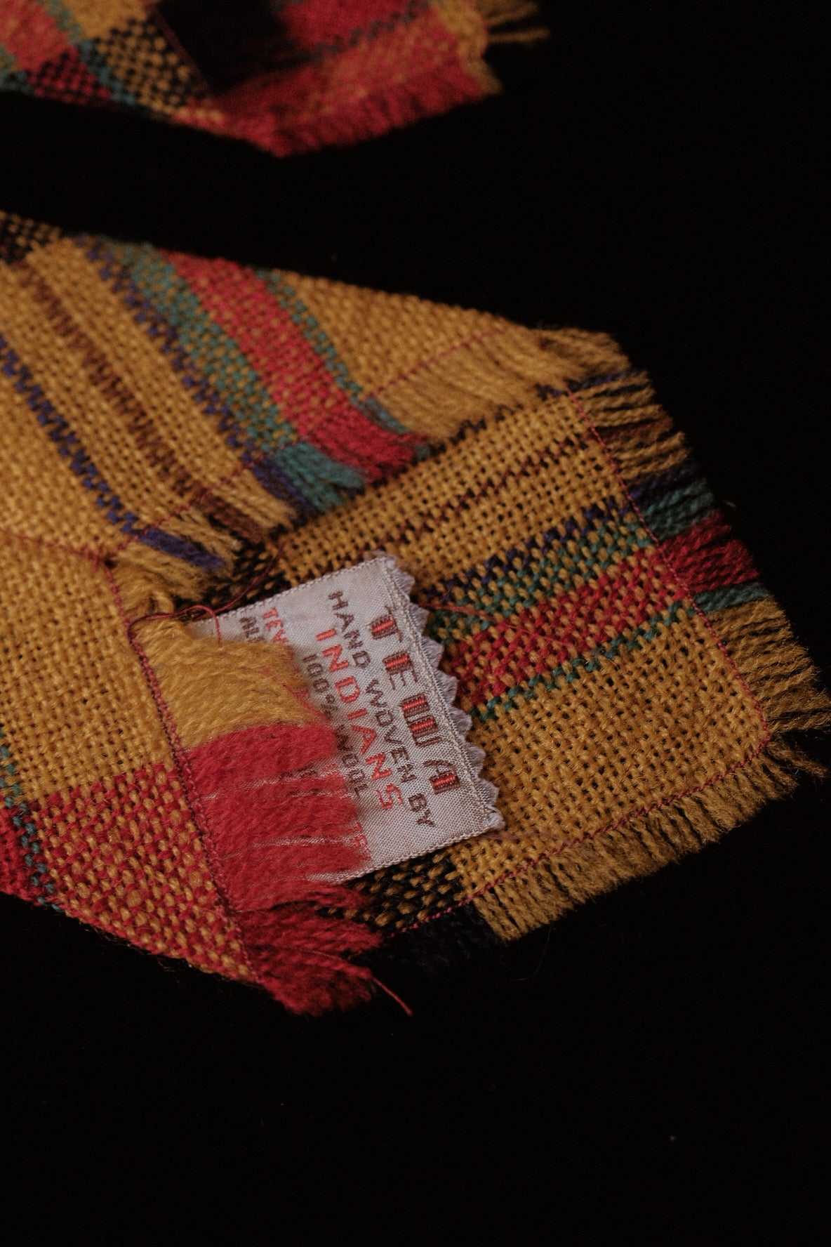 The Hand Woven Native American Tie by Tewa Weavers, crafted in the 1940s, features a vibrant check pattern that enhances visual interest. Its traditional aesthetics provide a unique touch suitable for both formal and casual settings. This tie is in very good condition, ensuring durability and style.