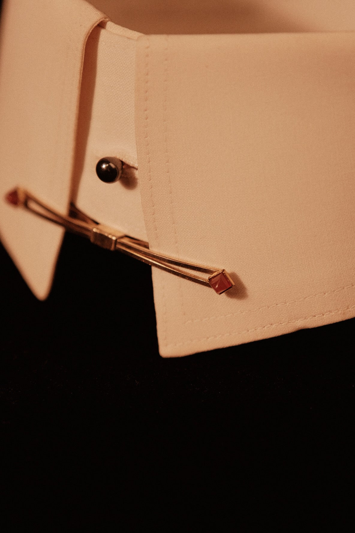 Finished in a warm gold tone and capped with square red glass terminals, this bar is designed to sit beneath the tie, gently drawing the collar points inward and lifting the knot for a sculpted, period-correct presentation. The clean lines and subtle colour at the tips give it just enough character while remaining elegant and versatile.